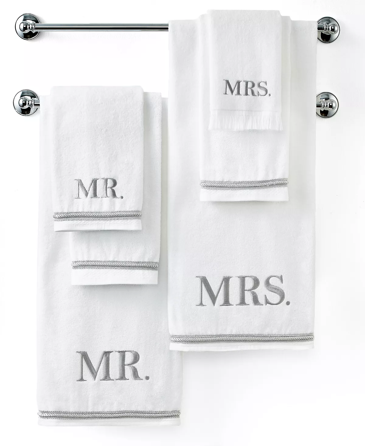 A great gift idea for any couple, especially newlyweds! These elegant towels feature Mr. and Mrs. embroidery in a lovely pewter hue with coordinating decorative trim.