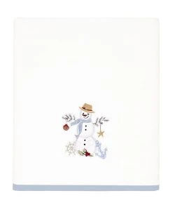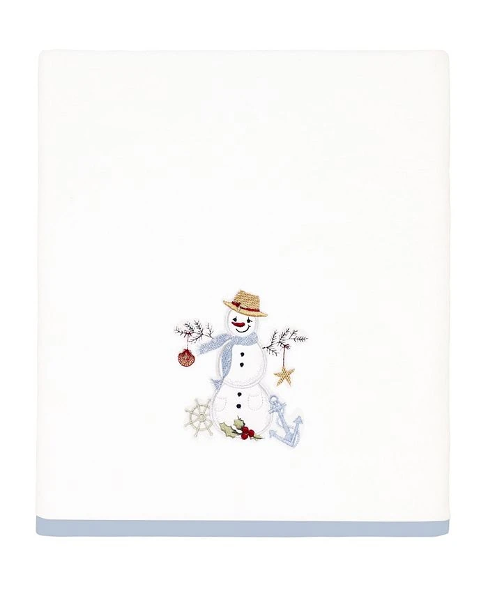The Avanti Coastal Snowman Bath Towel features an embroidered smiling snowman with a straw hat, polka-dotted scarf and holly with seashells, starfish, ship’s wheel and anchor one white velour towel. Finished with a coordinating light blue polyester border.