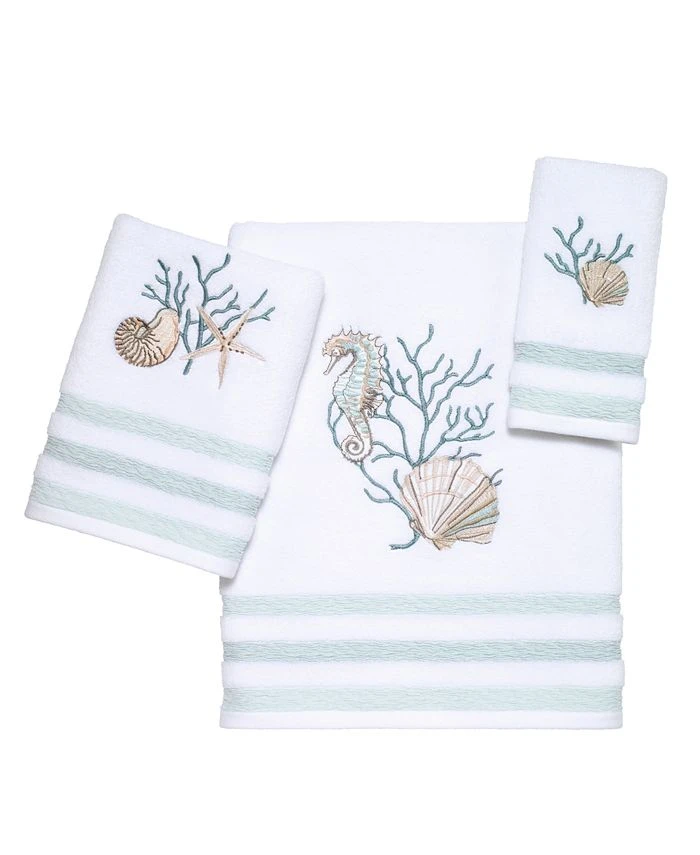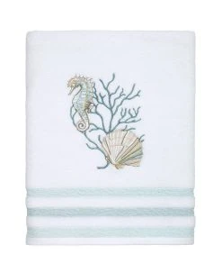 The Avanti Coastal Terrazzo Bath Towel features an embroidered seahorse, fan shell and coral in shades of blue and tan on a white terry towel with woven blue stripes.