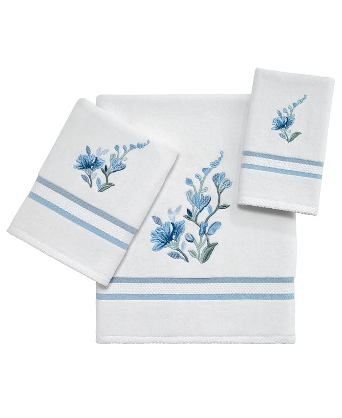 The Avanti Garden View Towel Collection features embroidery depicting a group of fresh spring blossoms in light and dark shades of blue with green stems and a woven, yarn-dyed blue border on an off-white ground.