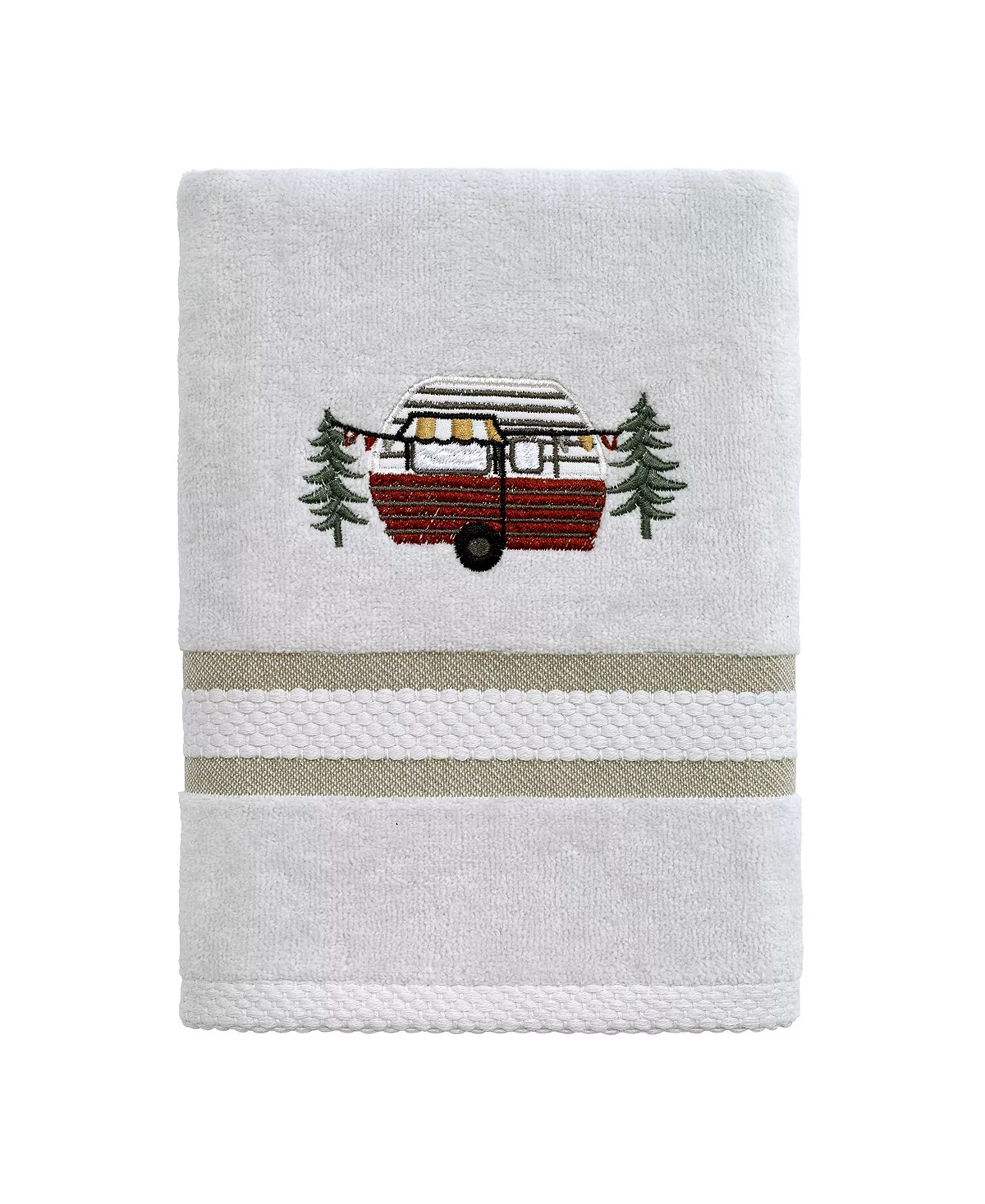 The Avanti gone glamping hand towel features an embroidered vintage-inspired camper in beiges and white and green pine trees on a beige ground. Made of soft and absorbent fabric ring spun. Coordinates with the matching accessories, shower curtain and rug.