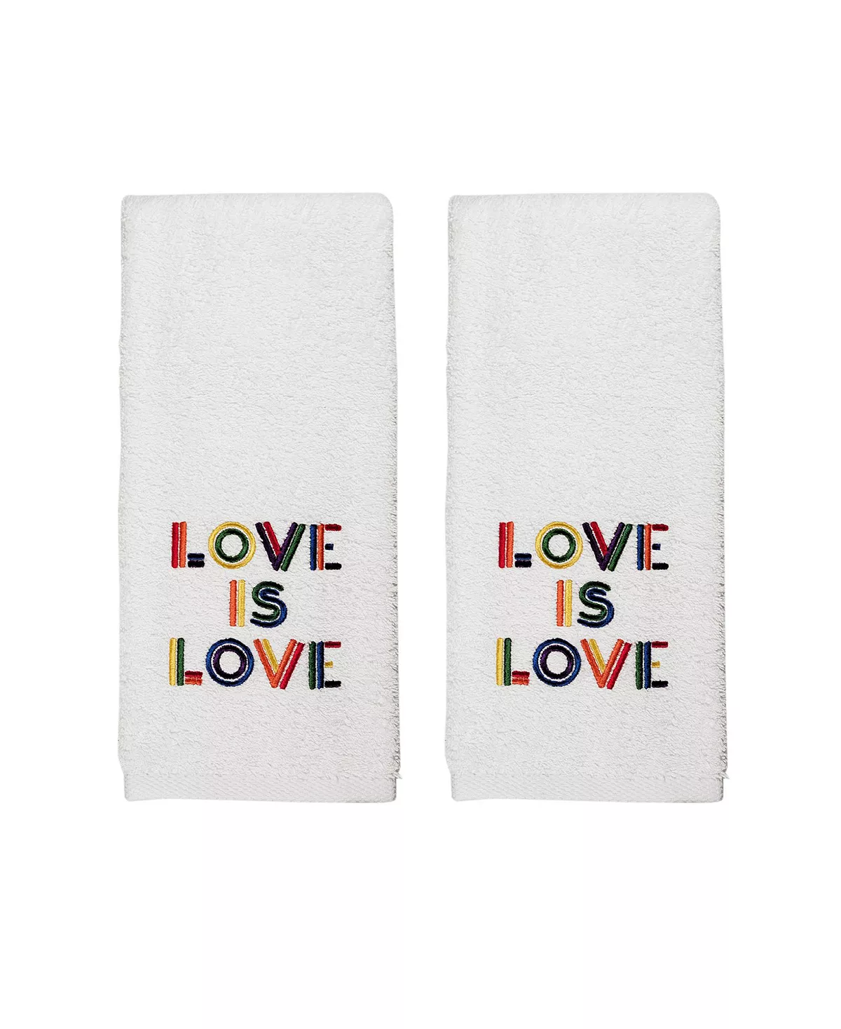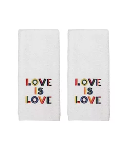 The Avanti Love 2 pack hand towel set is decorated with an embroidered colorful “Love is love” on a white terry towel. Show your pride–add a splash of color to your bathroom or give as a gift.