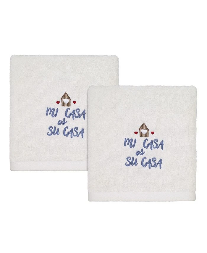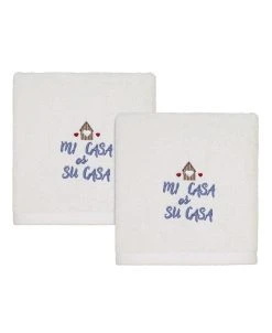 The Avanti Mi Casa Es Su Casa my house is your house 2-pack of decorative hand towels features the saying embroidered in blue with a house with hearts above. Woven out of 2-ply ringspun cotton for superior softness and absorbency.