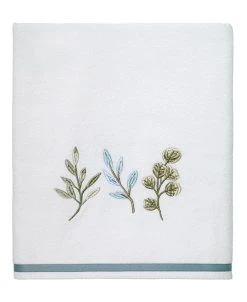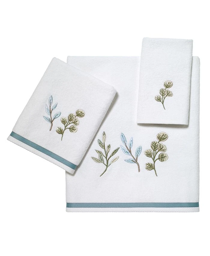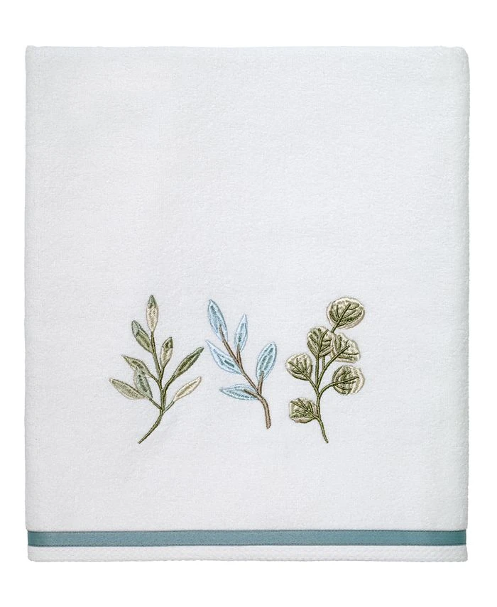 The Avanti Ombre Leaves Bath Towel features beautifully embroidered branches with leaves in shades of green, blue and beige on a cotton velour towel. The towel is finished with a coordinating blue stripe.