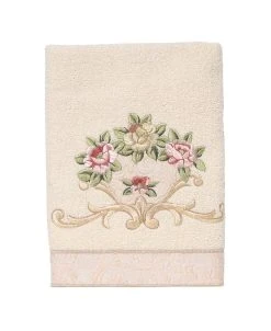 Add an elegant dash of English grace to your powder room with Avanti Rosefan hand towels. Embroidered with a delicate flower design and finished with a textured jacquard border.