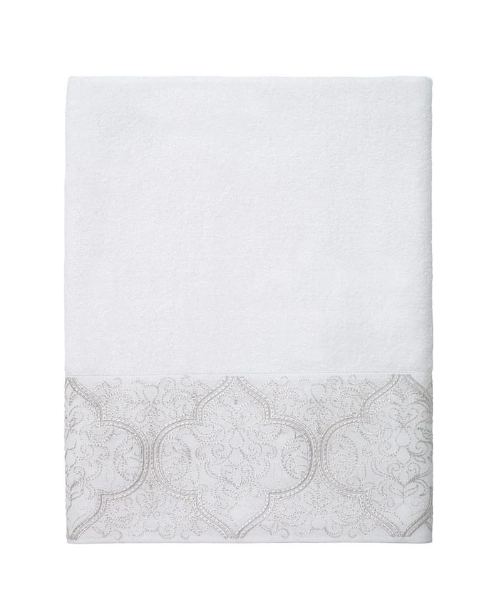 The Avanti Scottsdale Bath Towel features a dry, tonal fabric border with a beautifully embroidered ivory scroll design on a white sheared towel.
