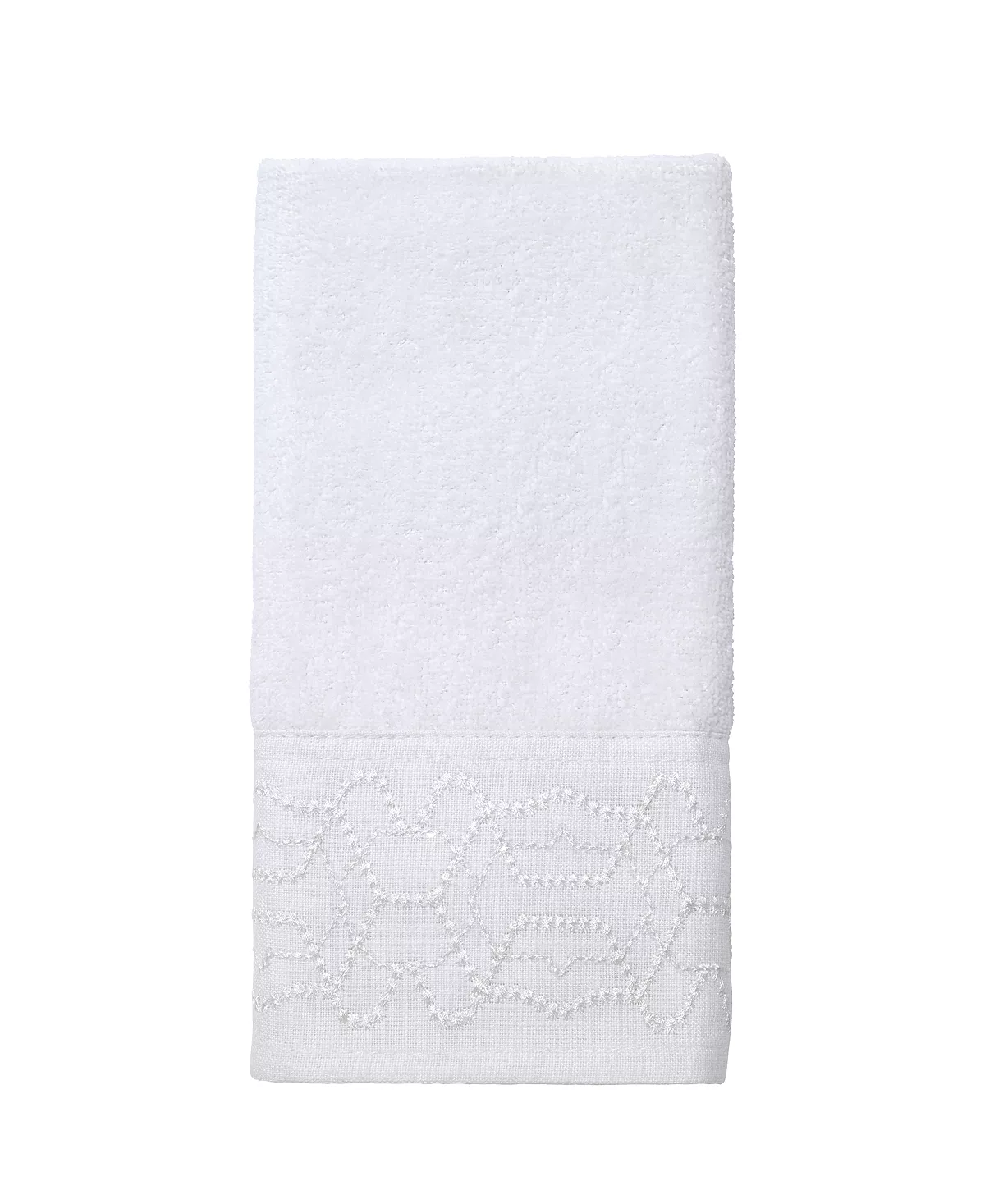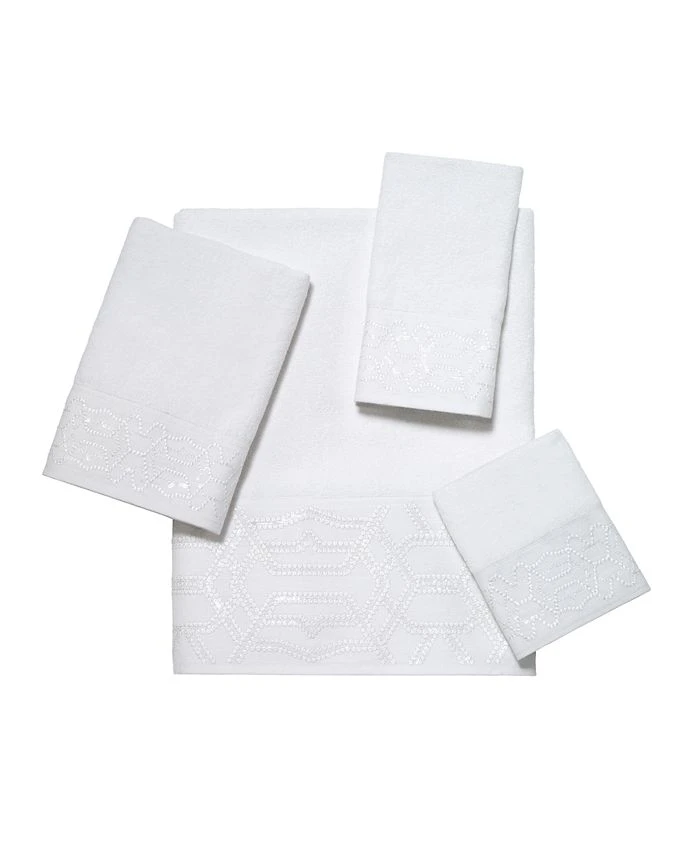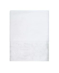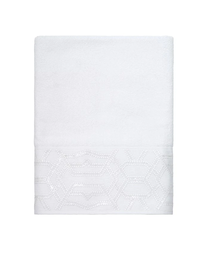 The Avanti Serafina Bath Towel is decorated with a dry, tonal fabric border with white embroidery forming a geometric pattern and clear sequins for a hint of shine. The white towel is sheared for an elegant, upscale look.