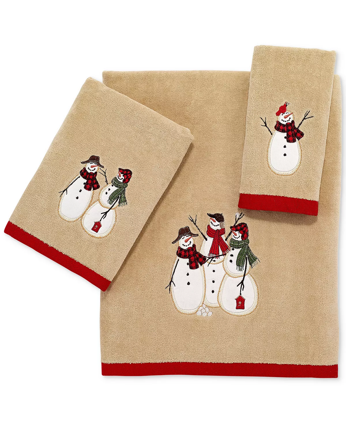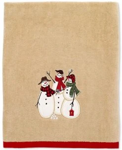 Trim your space for the season with the spirited Snowman Gathering Cotton bath towel by Avanti. This neutral-toned velour piece has an embroidered trio of frosty friends and a red trim that lend a buoyant note to your bath.