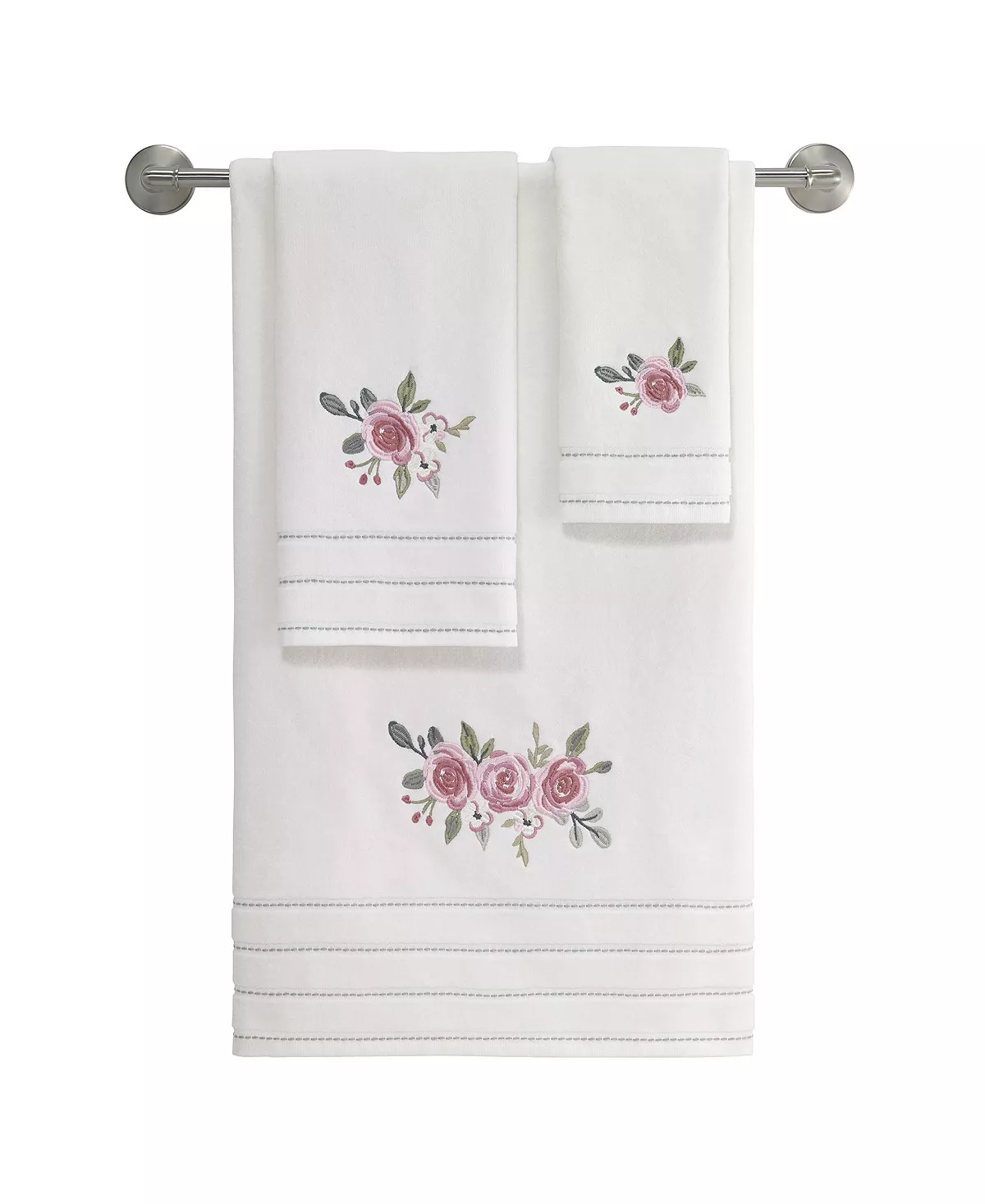 The Avanti spring garden bath towel is decorated with 3 embroidered peonies in shades of pink with green leaves and woven, yarn-dyed green border stripes on an ivory ground. Made of soft and absorbent fabric ring spun. Coordinating pieces also available.