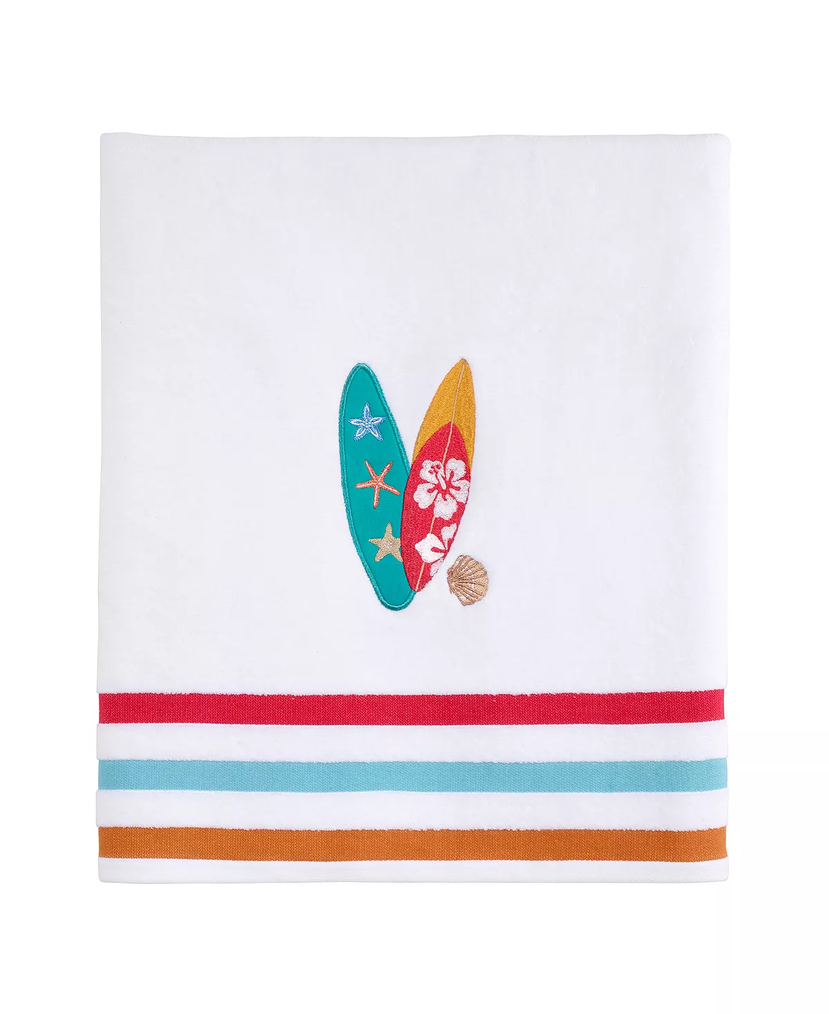 The Avanti Surf Time Decorative Bath Towel features 2 brightly colored embroidered surfboards in green and yellow or coral shell on the side. The white terry towel is made of cotton exclusive of embellishment. The sky blue, coral and mustard borders add the perfect finish to the towel.