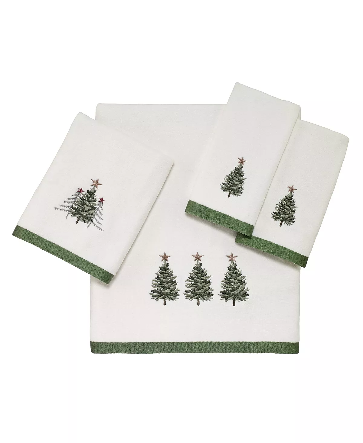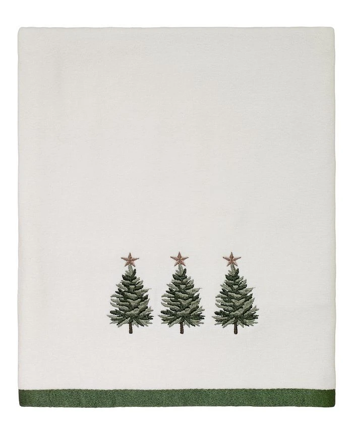The Avanti Trees Bath Towel features 3 embroidered pine trees in contrasting shades of green with gold stars on a exclusive of embellishment and border white velour towel. Towel is finished with a coordinating green polyester border.