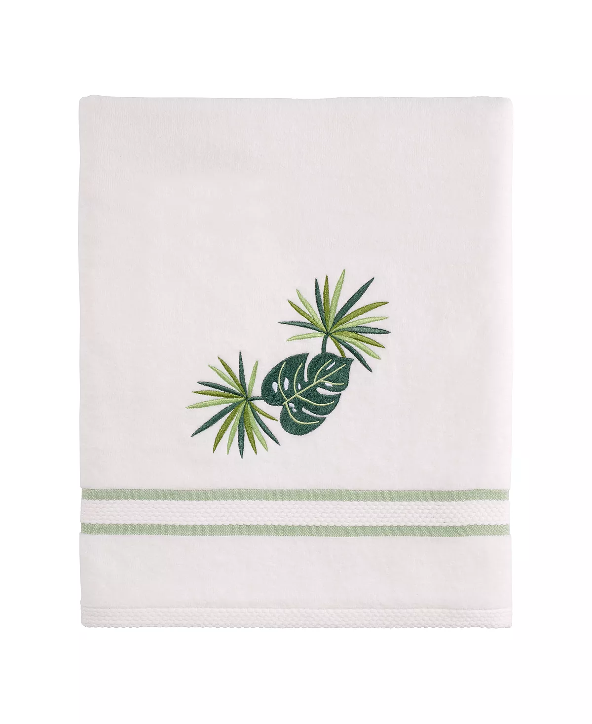 The Avanti Viva Palm Decorative Bath Towel features a beautifully embroidered petticoat palm and split leaf philodendron design in various shades of green on a white terry ground. Towel is exclusive of embellishment, with coordinating green stripes to finish the look.