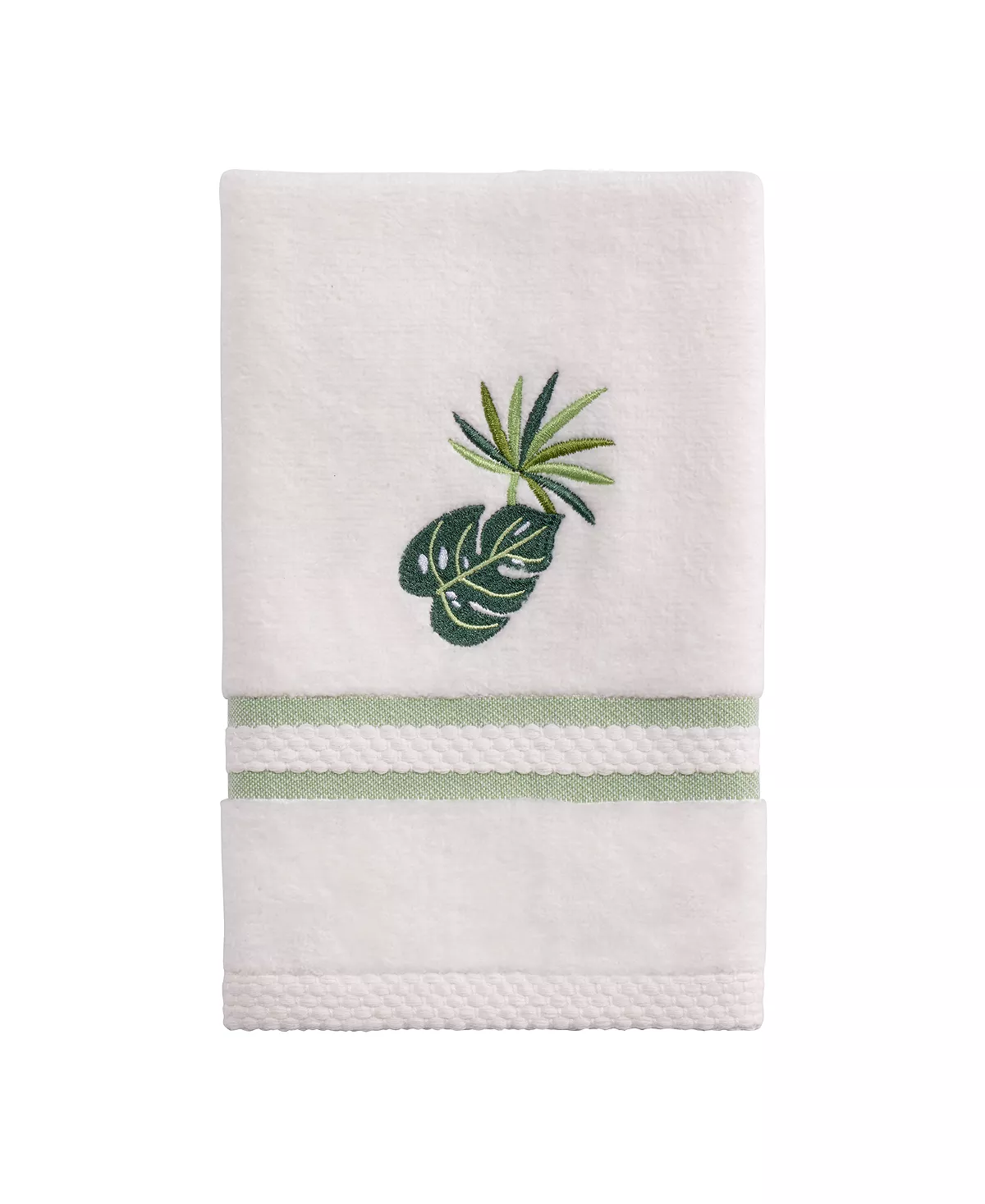 The Avanti Viva Palm Decorative Fingertip Towel features a beautifully embroidered petticoat palm and split leaf philodendron design in various shades of green on a white terry ground. Towel is exclusive of embellishment, with coordinating green stripes to finish the look.