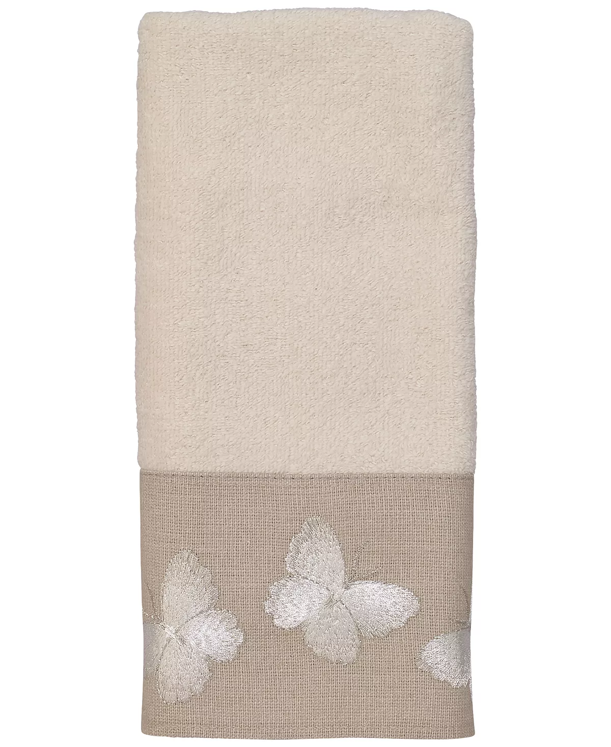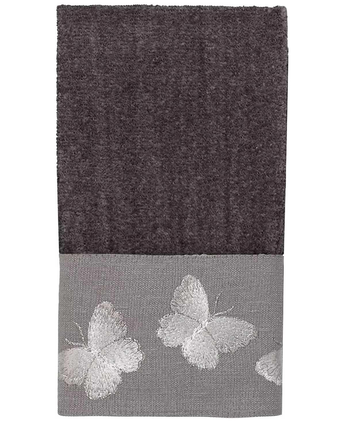 The Avanti Yara Fingertip Towel features a series of delicately embroidered white butterflies on a grey border attached to a 100% cotton granite velour towel.