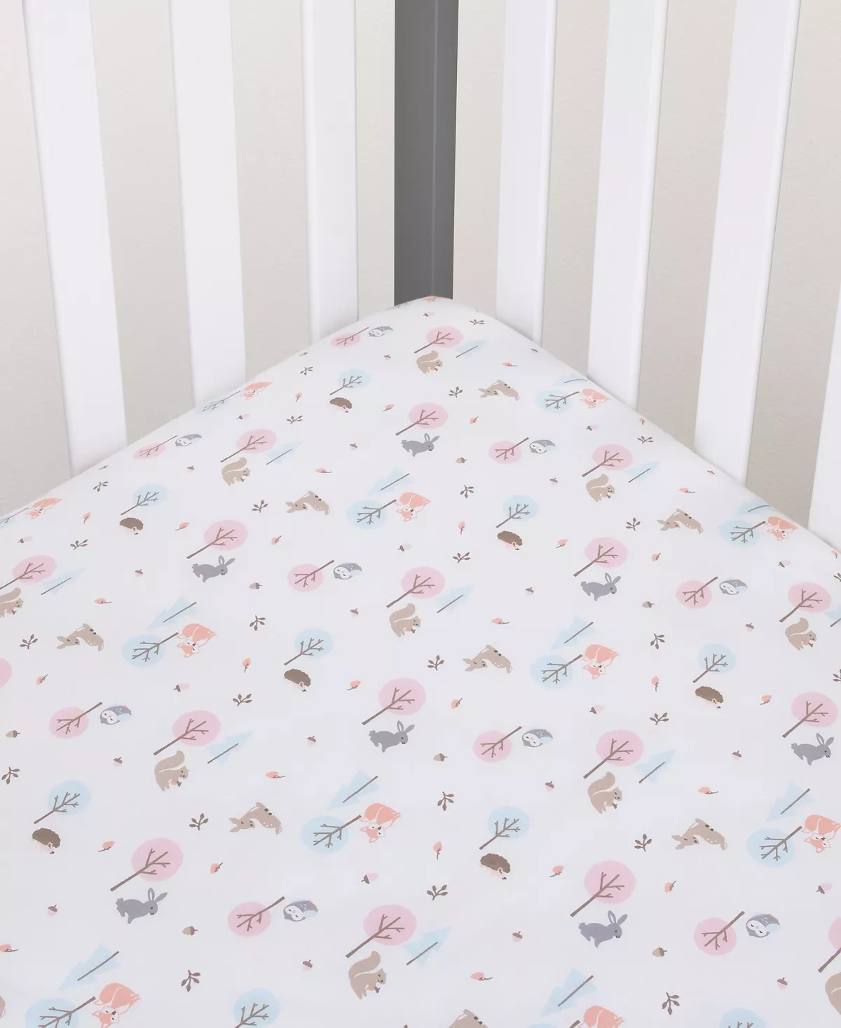 Your little one will sleep soundly among the beautiful flowers, foliage and cute forest creatures included in this woodland design. This mini fitted crib sheet is perfect for a feminine, woodland-themed nursery.