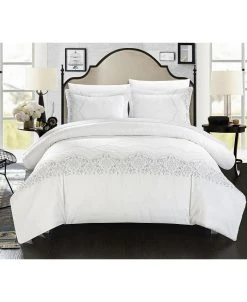 A fashion forward duvet cover featuring a bridal collection design with intricate embroidery. Design coordinated shams are included to complete the look. Zipper closure for easy use and care.