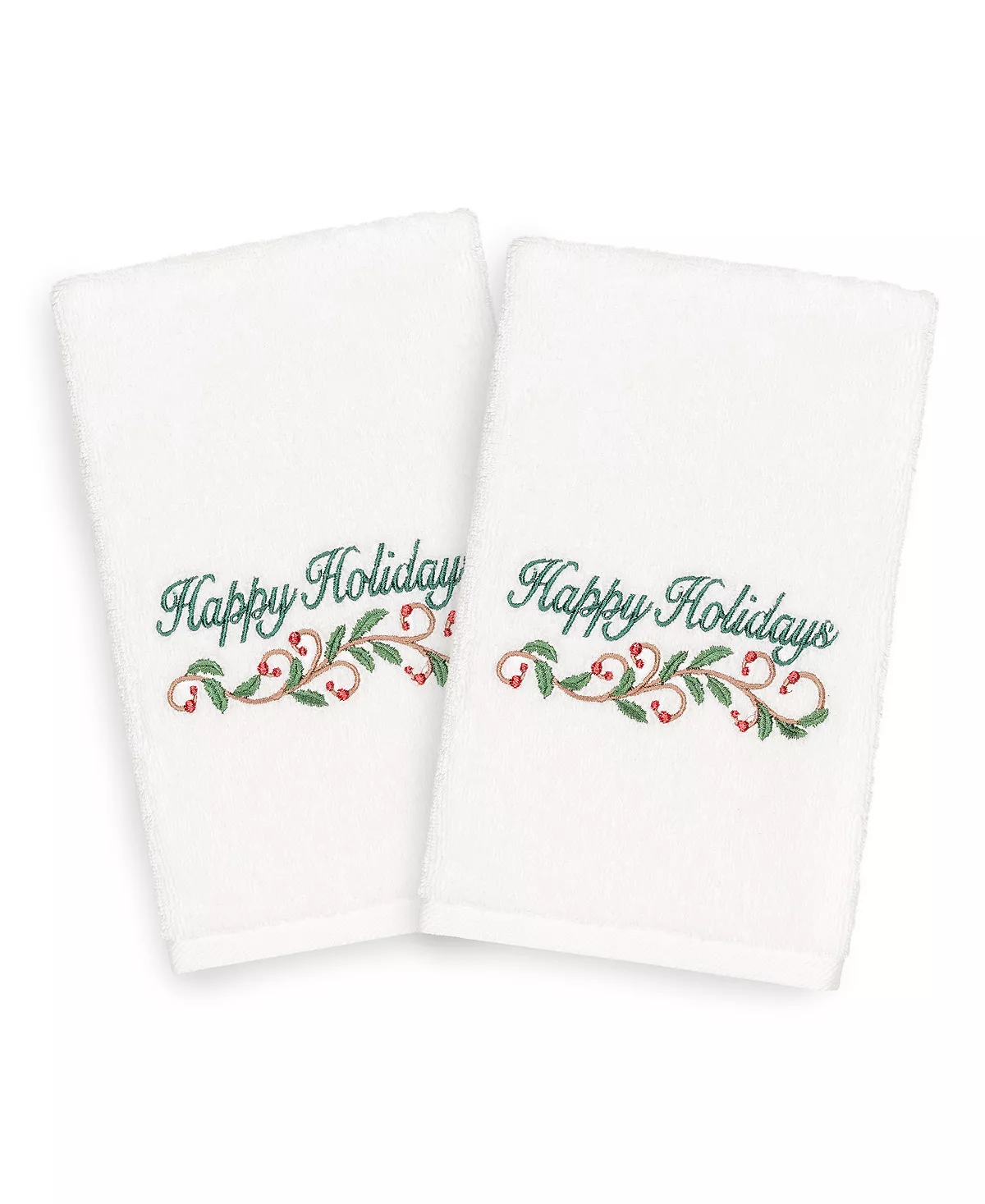 Bring a joyous Christmas spirit to your decorations with elegant embroidered hand towels for your guest bath. These “Christmas Happy Holidays” towels feature a garland of holly leaves & sparkling berries gracing the traditional greeting in script, which will add a merry mood to your festivities! This special & luxurious Christmas towel is manufactured with more cotton per square inch for maximum softness and absorbency. Our products are produced in Linum’s state-of-the-art vertically integrated green factory in Turkey, which runs on 100% solar energy.