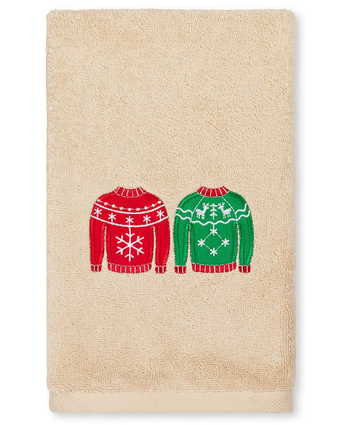 Your Christmas decorations are not complete without lighthearted embroidered hand towels for your guest bath. These “Christmas Sweaters” towels feature two whimsical colorfully patterned sweaters, which bring holiday spirit to your home.