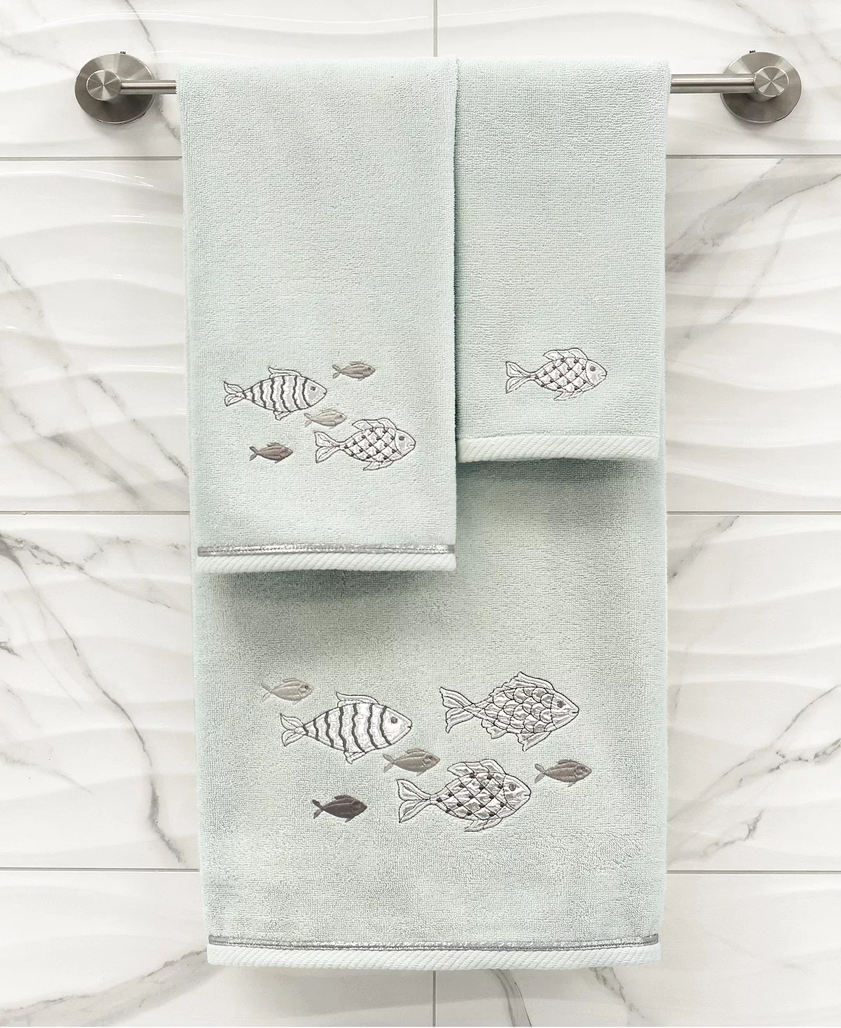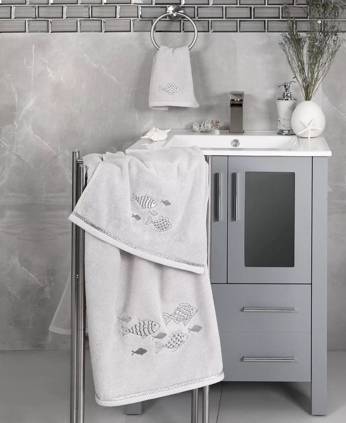 The FIGI towels feature sparkling applique fish and are trimmed with a matching cord. Cloud soft and super absorbent, these luxurious, durable towels keep their plush appearance after washing. The FIGI towel collection brings a coastal spirit and richness to your home decor and makes a great gift.