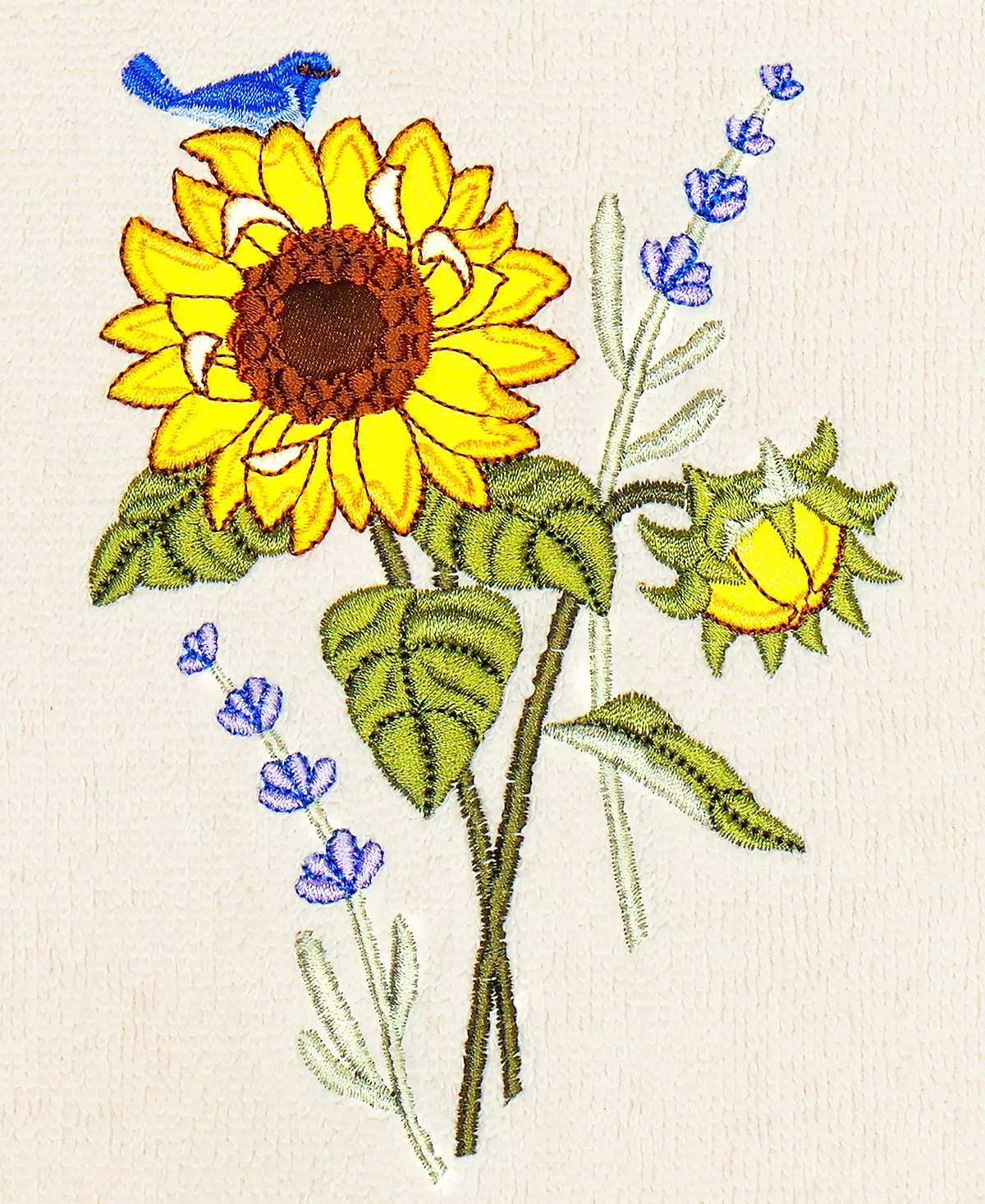 Create a mood of country charm in your bath with the GIRASOL Embellished towel collection. These towels feature an applique embroidered bouquet of vibrant sunflowers and lavender, highlighted by a bright bird perched on top. This collection brings a natural spirit and richness to your home decor.